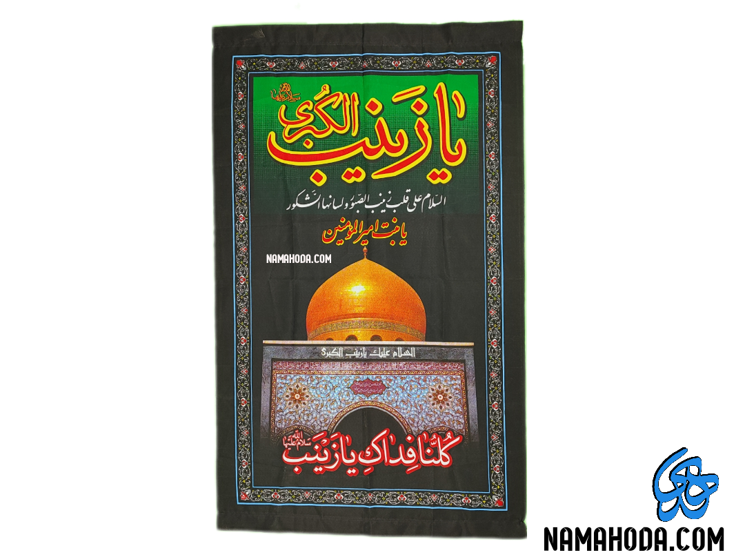 پلاکارد عمودی در انداره 160*90 با نقش گنبد و نام حضرت زینب س دو سر جاچوب مناسب نصب در هیئات و درب منازل