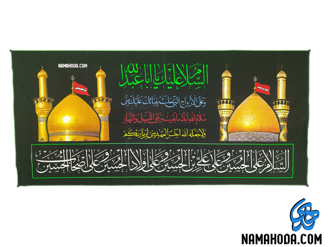 پلاکارد افقی سلام زیارت عاشورا و طرح گنبد 200*90 پارچه فلامنت مناسب نصب در هیئات و سردر منازل